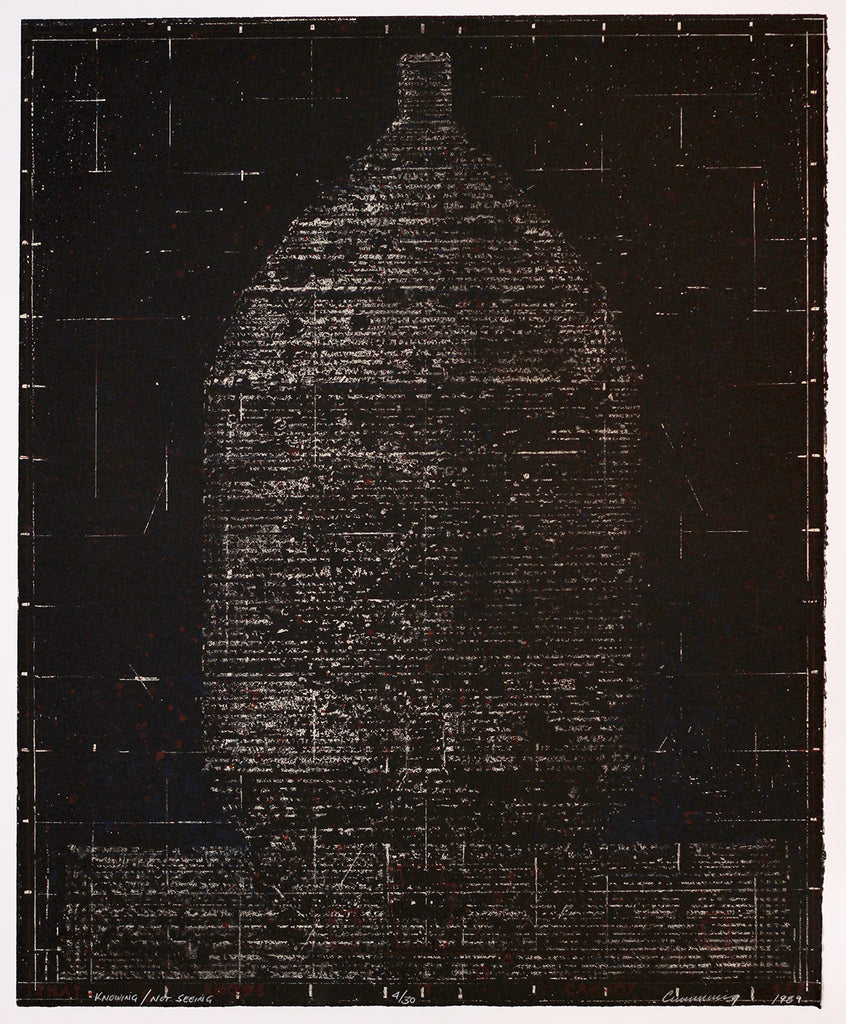 "The Eye/Mind Set suite of lithographs was produced during my residency at The Print Club of Philadelphia in 1989. I had just made my first trips to the granite quarries of Vermont; the textural parallel is obvious. The four objects depicted have varied origins: a fat, poorly drawn apothecary vessel from a drugstore sign in Philadelphia; a Morton Thiokol rocket engine; a short, sharped pencil; and a hive-like threaded-spool identical to those I was having fabricated of granite in Vermont. I've worked a few subtleties on the four images so that their scale is indeterminate. They can be of a size to be held in the hand, on the scale of monuments, or on the massive scale of architecture (there is a small entry-way in the base of each).