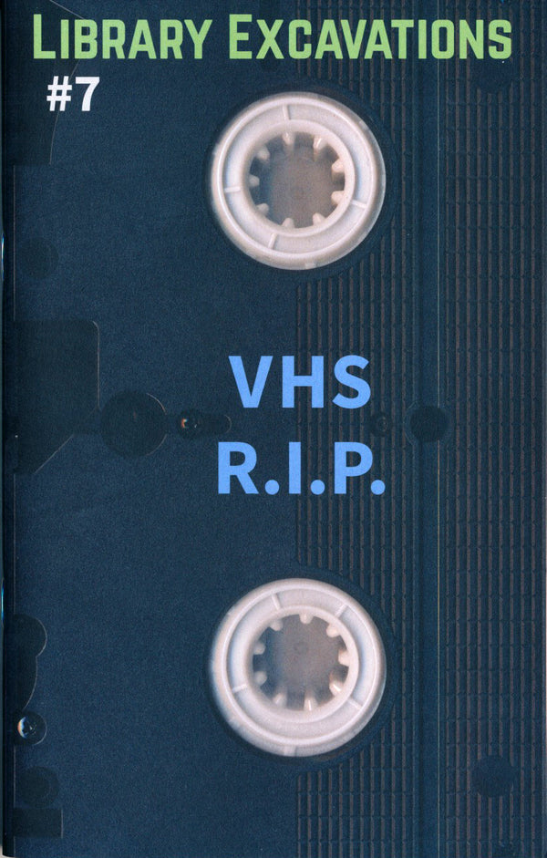 Library Excavations #7 mourns and explores VHS tapes in the public library lending collection. In addition to text and photos from the collection and the discard piles, this booklet also contains reflections on the history of VHS at Chicago's Harold Washington Library Center by librarian Bob Sloane, and thoughts on the state of VHS relative to videos by artists from Abina Manning, the Director of Video Data Bank at the School of the Art Institute of Chicago. From the back cover: