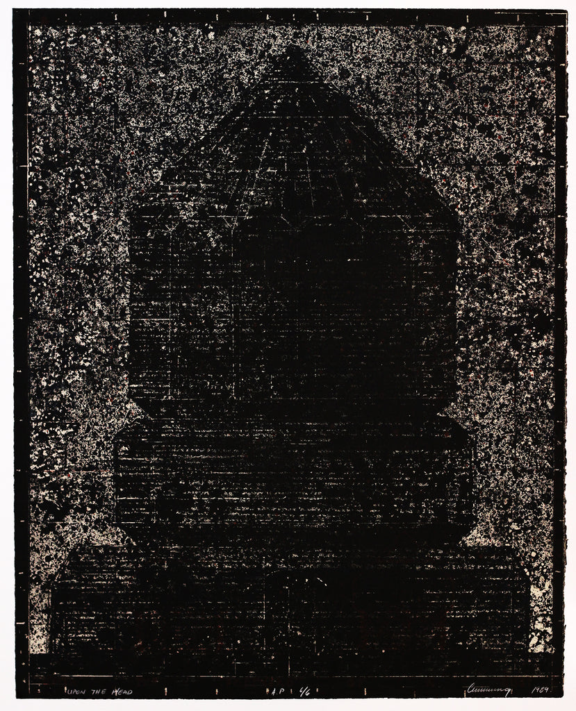 "The Eye/Mind Set suite of lithographs was produced during my residency at The Print Club of Philadelphia in 1989. I had just made my first trips to the granite quarries of Vermont; the textural parallel is obvious. The four objects depicted have varied origins: a fat, poorly drawn apothecary vessel from a drugstore sign in Philadelphia; a Morton Thiokol rocket engine; a short, sharped pencil; and a hive-like threaded-spool identical to those I was having fabricated of granite in Vermont. I've worked a few subtleties on the four images so that their scale is indeterminate. They can be of a size to be held in the hand, on the scale of monuments, or on the massive scale of architecture (there is a small entry-way in the base of each).