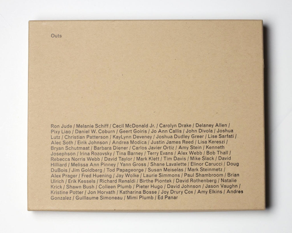 "For this publication, the editors of SKYLARK EDITIONS asked 70 artists to provide us with a photograph which didn’t fit into any of their projects, their OUT, but remained compelling for them nonetheless. Using the 1978 text Brief Notes on the Art and Manner of Arranging One’s Books by George Perec, publishing partner and book designer Hans Gremmen of Fw:Books embraced the challenge of sequencing these 70 disparate images resulting in a truly unique object. The images included in OUTS create new relationship pairings that are printed using silver ink on black paper, an ode to honoring these outliers. With the addition of all 72 images as artist cards, we have created an object that is both constructed and infinitely changeable all housed inside a custom box.