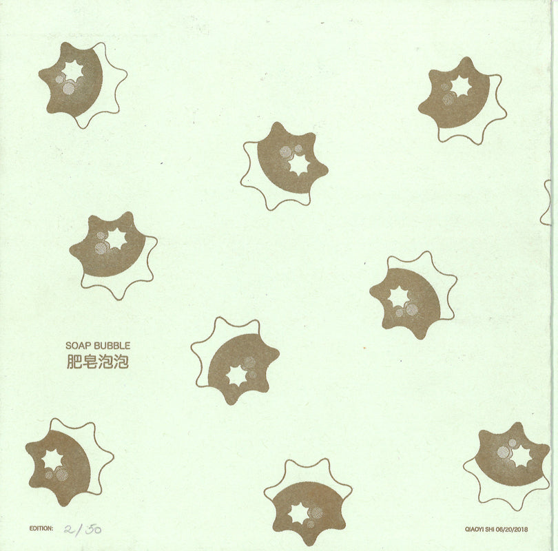 Eight-page folded accordion book of risograph prints featuring geometric designs, cats and curious figures, all rendered in Shi's signature style.