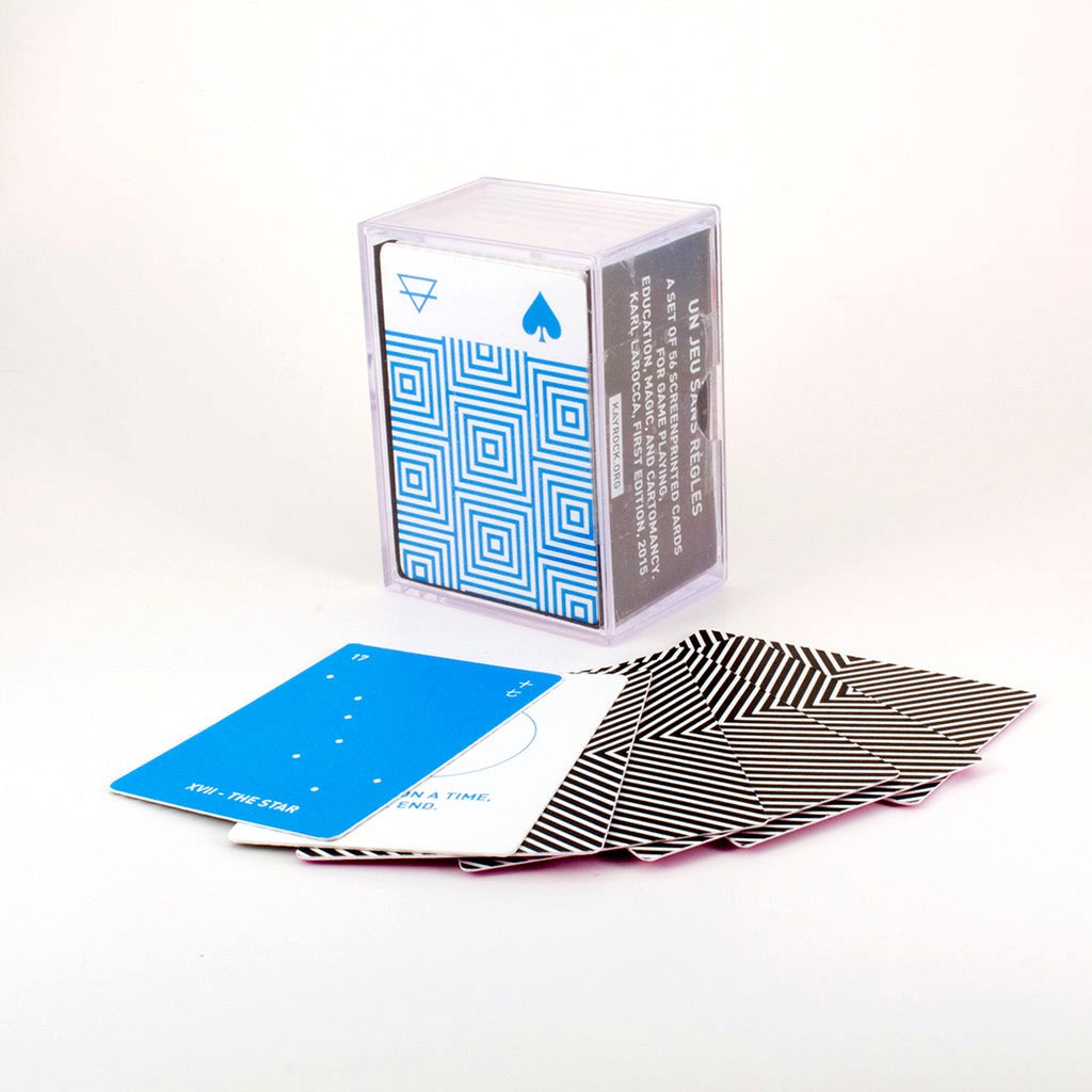 "The Game With No Rules ( UN JEU SANS RÈGLES ) is a set of 56 Screen-printed cards for game playing, education, magic, and cartomancy designed by Karl LaRocca and printed at Kayrock Screenprinting on 2 ply rising museum board. Varnished and trimmed with rounded corners. First Edition 2015.