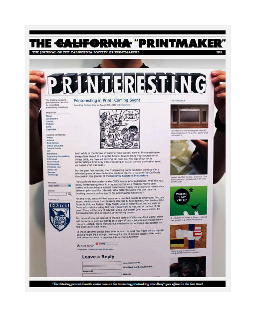 It’s finally here- The California Printmaker guest-edited by Printeresting! At the beginning of 2011, printeresting.org was approached by Anthony Ryan and Meri Brin of the California Society of Printmakers about guest-editing the 2011 edition of the journal. It’s a 32-page exploration of the relationship of print to internet with a long list of contributors. The magazine includes original writing, original print-related comics, artist profiles as well as an offset poster insert.